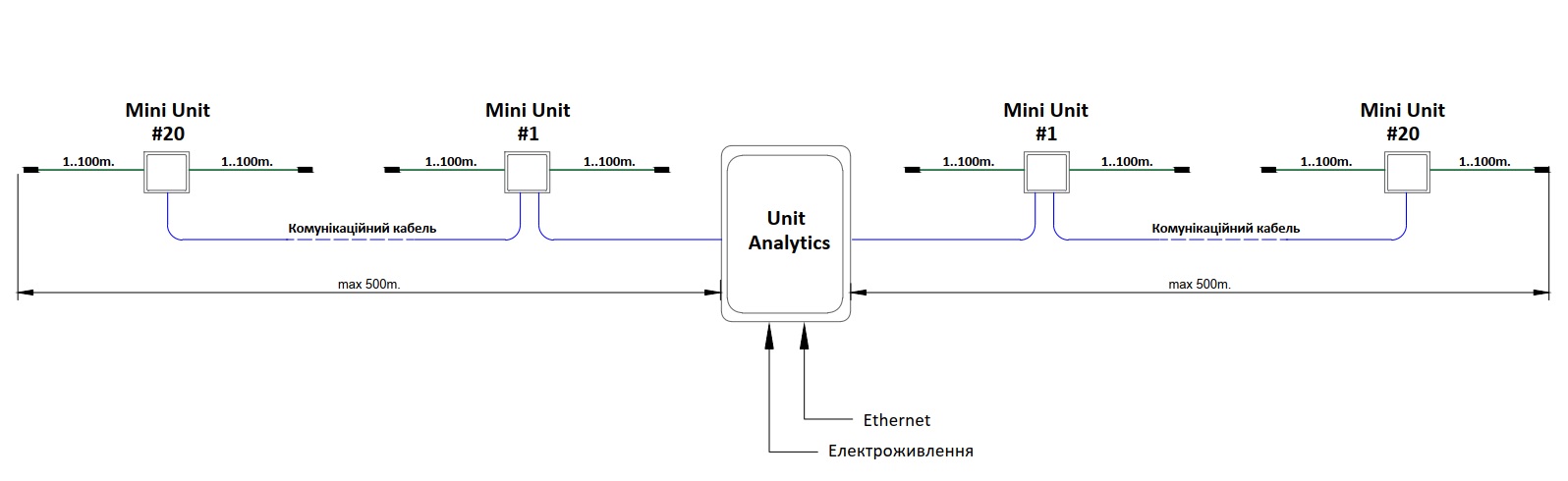 Mini Unit приймає сигнал від двох чутливих кабелів, що утворюють зони лівого та правого плеча вібраційної системи блокування периметра. Зони виявлення вздовж периметра формуються шляхом послідовного покаскадного з'єднання. Живлення модуля забезпечує центральний блок Unit Analytics. Mini Unit оснащений наступними комутаційними елементами: